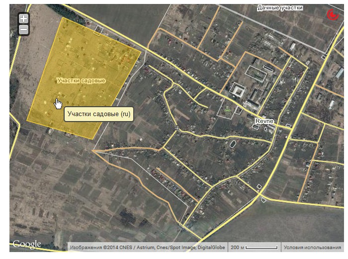 Такое поле мы и нашли, см. выделенное на картинке. Поле примыкало к селу Ревне, см где это на общей схеме ниже. Сельчане пасли там коров. Земля стоила 600 $/сотка с назначением «Под садоводство» (всего через два года эта стоимость уже 1200-1500 $/ сотка).