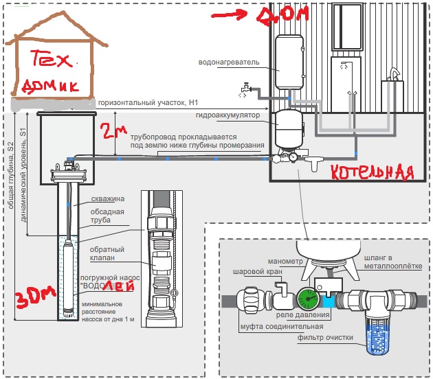1) Расположение. Скважина может находиться в доме, тогда бурить ее нужно на территории дома. Но хороший вам совет — вынесите все технические мощности как то скважина, котел, генератор — в отдельный технический домик. Ведь это шум, это грязь, это песок, это дым — зачем Вам в доме эти вещи? НЕ забудьте еще на этапе фундамента дома зарыть пару труб для того чтобы завести воду и тепло в дом. Чтобы потом не рыть под фундамент и не долбить его!