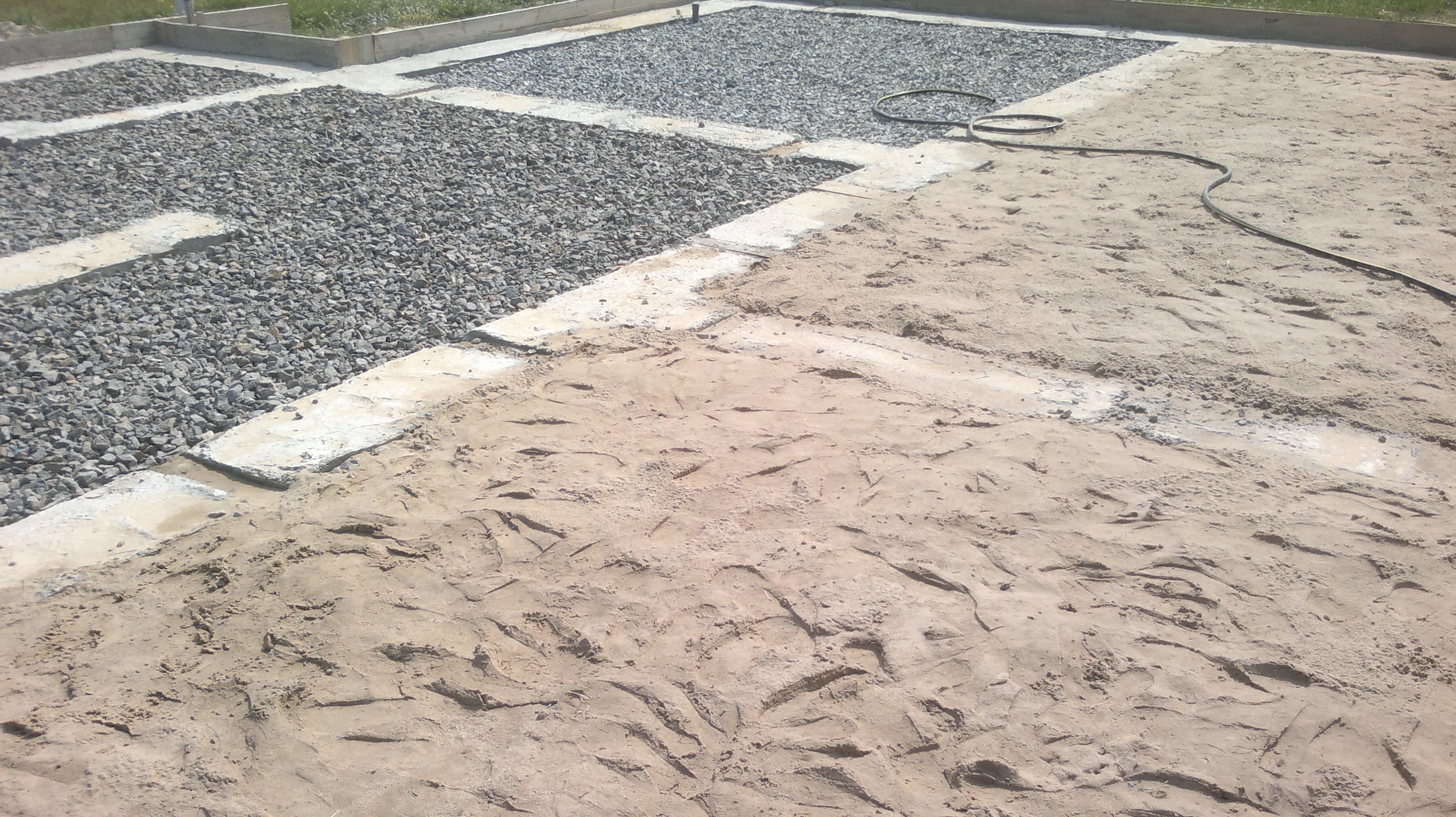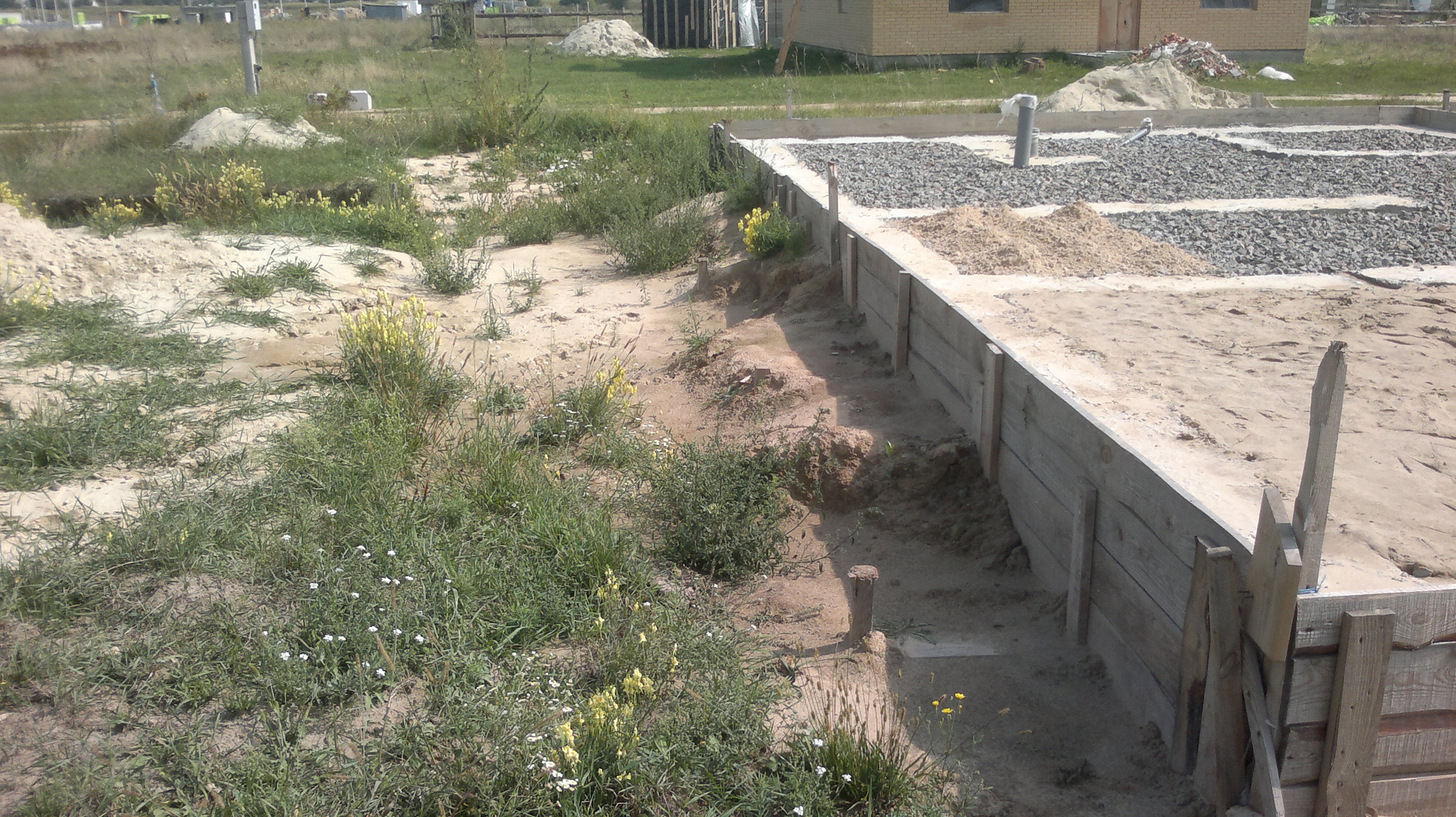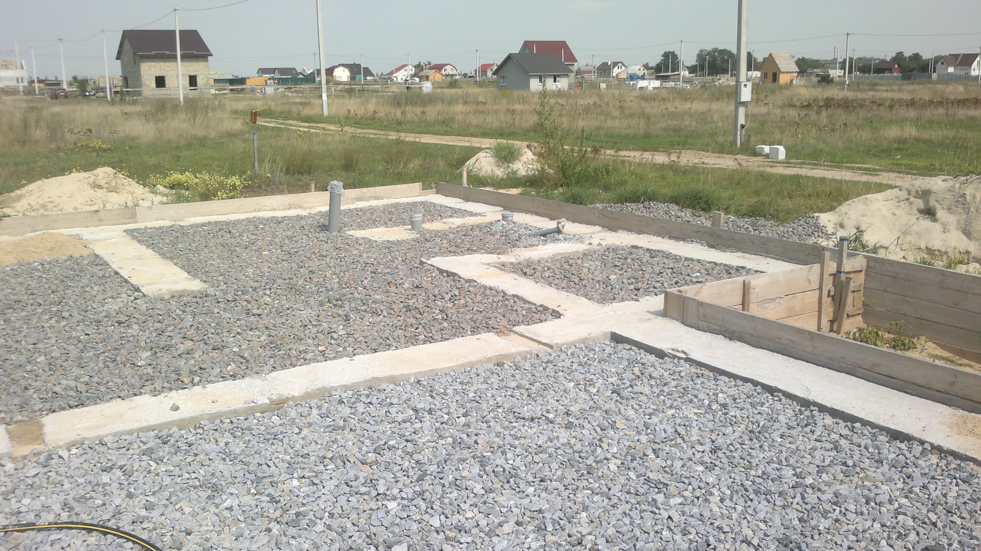 Траншеи прорыты, опалубки выставлены. Единственный раз когда мы купили готовый бетон — был бетон для ленты. Читай выше. Все так и было:) Залитая лента выстаивалась почти три месяца до августа. Полости внутри ( будущие комнаты) нужно было засыпать землей, пролить, затем засыпать щебнем, затем песком. Вровень с лентой.