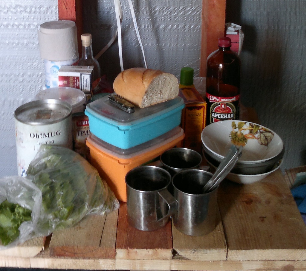 С появлением тех. домика я привезла электрическую плиту на два блинчика (280 грн) и старый электрочайник. Пару деревянных досок для разделки, стальную посуду: миски и кружки. Две кастрюльки из маминого приданого:) котелок и алюминиевую на 3 литра, а также старенькую сковороду Tefal. Вот почти весь этот нехитрый, но очень универсальный набор.