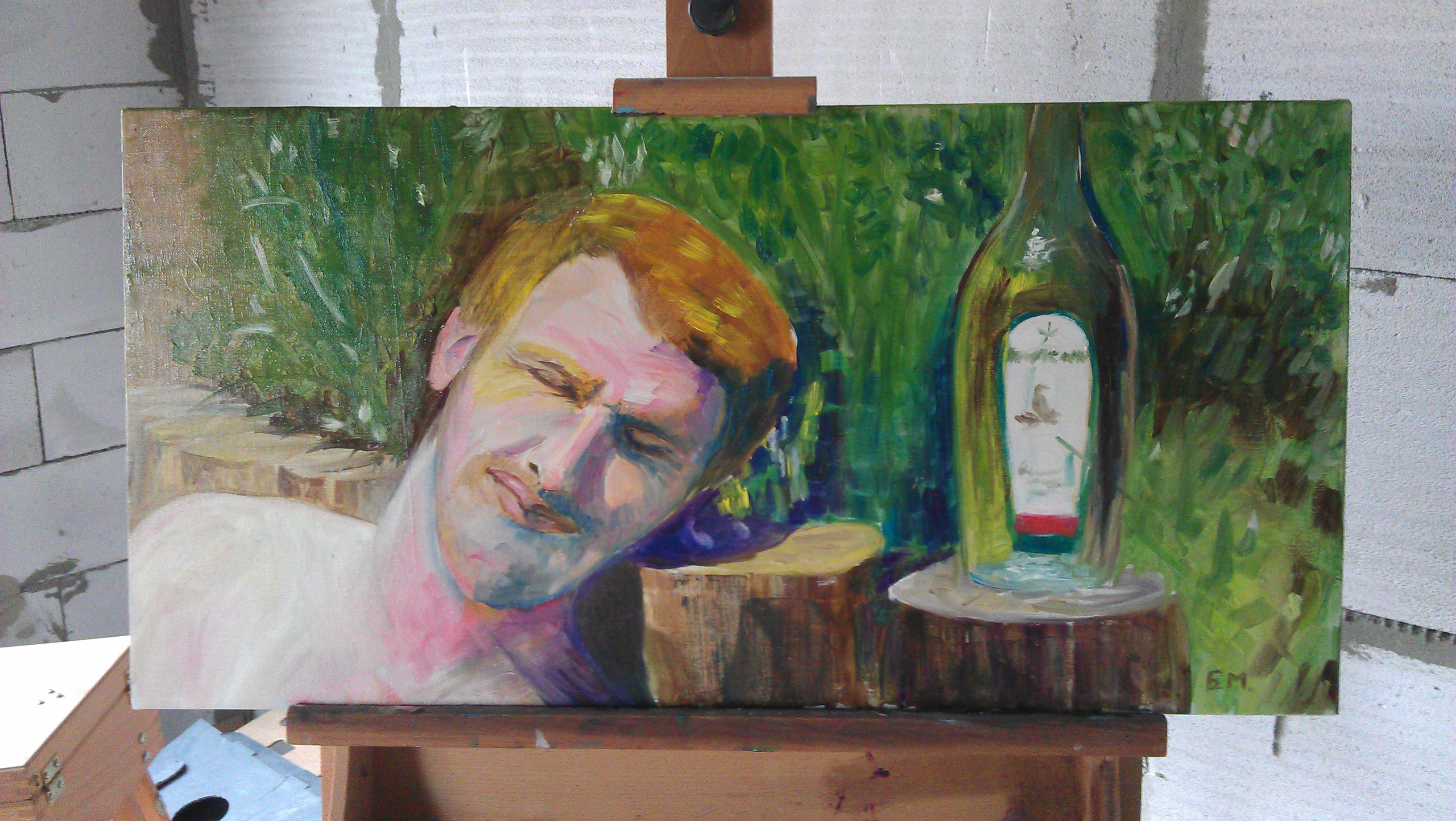 И под конец веселая история. Цветущий огород, «Перепелка» и прикорнувший Гриша вдохновили меня на очередной портрет. Ниже в формате исходник и картина. Ну, чего только на стройке не увидишь? Мне было очень любопытно потом: как сам Григорий отреагирует на свой портрет. Высказался он лаконично: «А что?… Я тут красивый!» :)))