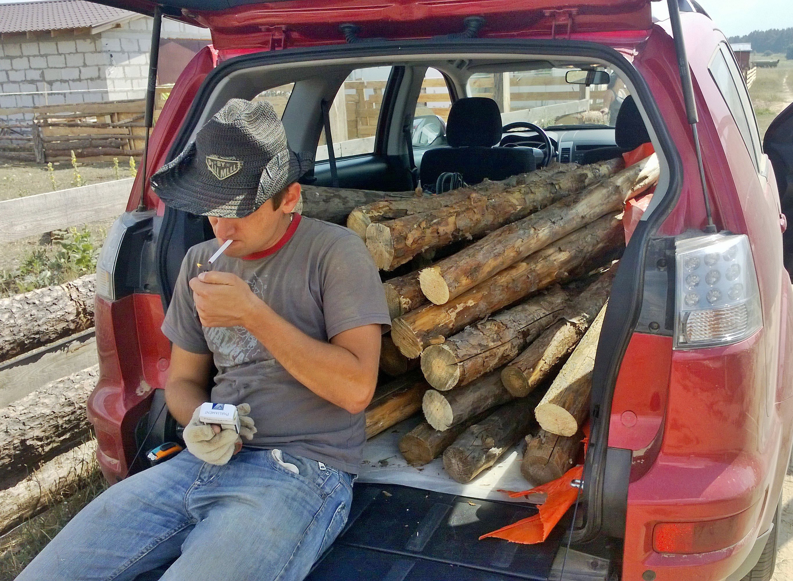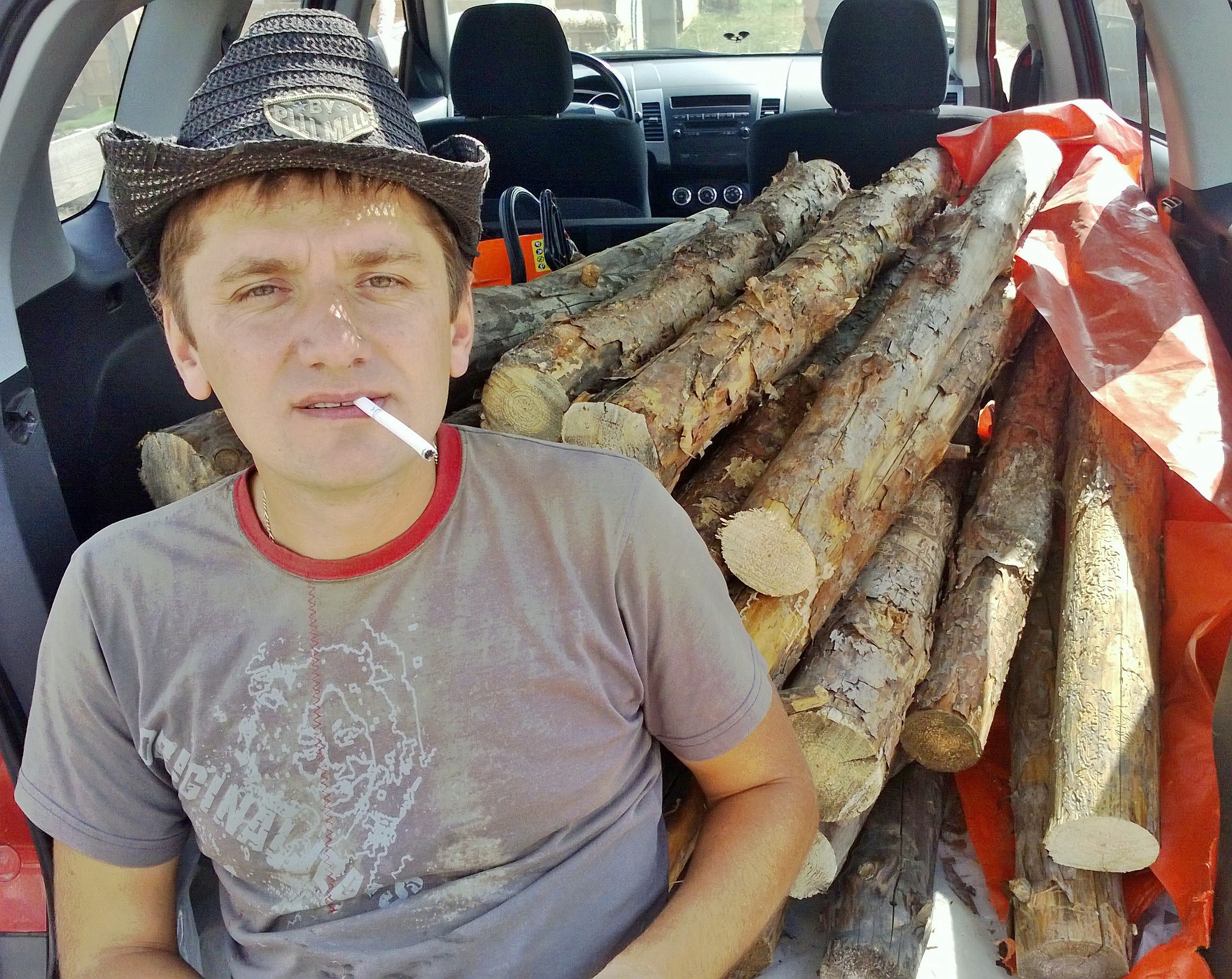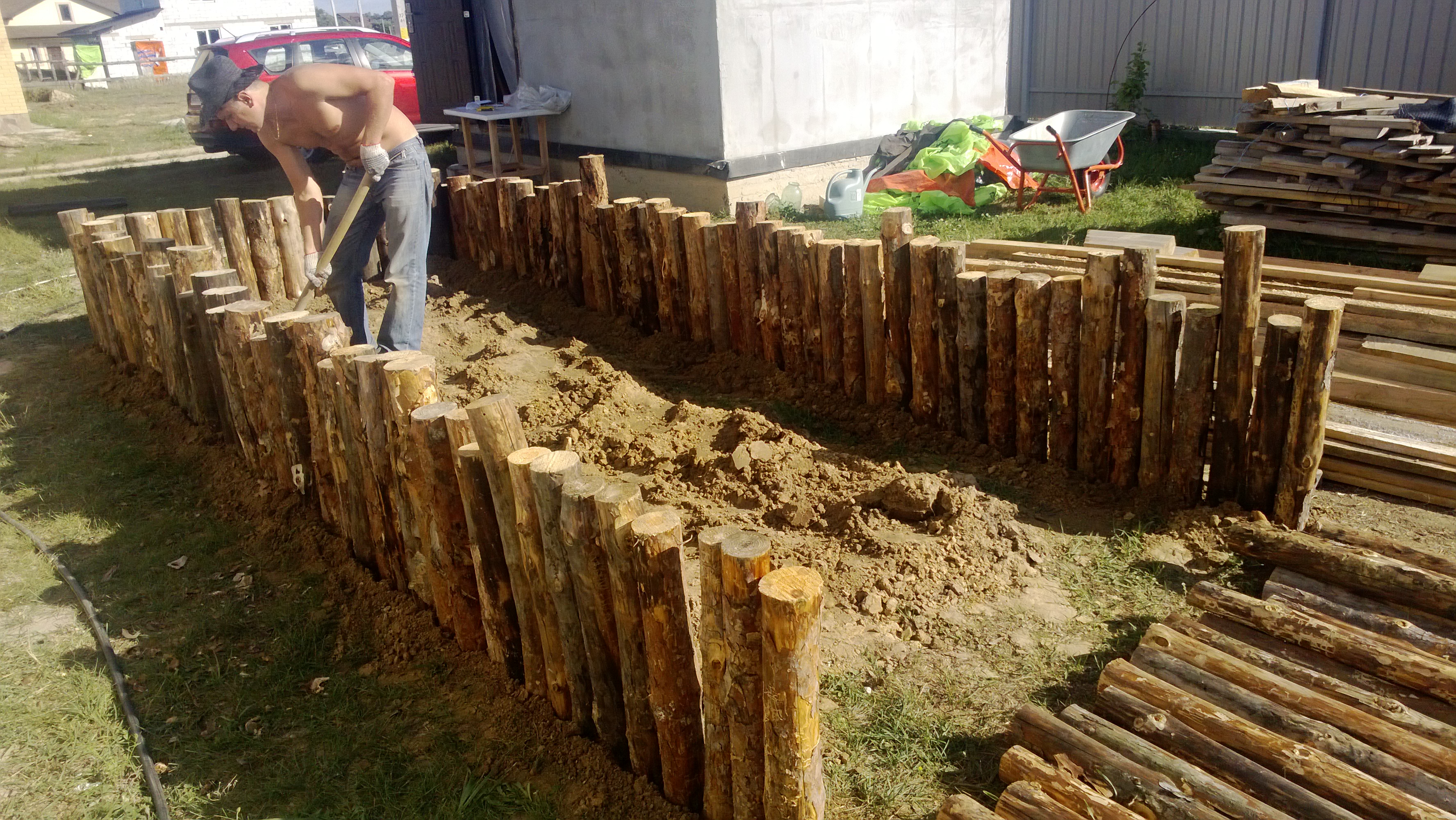 Но прежде нам были нужны сами сосновые бревнышки. Не очень толстые, но и не тонкие, диаметр 10 см. Длина нарезки 80 сантиметров, в штуках примерно 100 штук. Мы их частично заготовили в лесу. Да-да, поехали под Процив пару раз с бензопилой и заготовили. А часть досталась от соседа, который покупал бревна на временный забор, а остаток отдал нам.