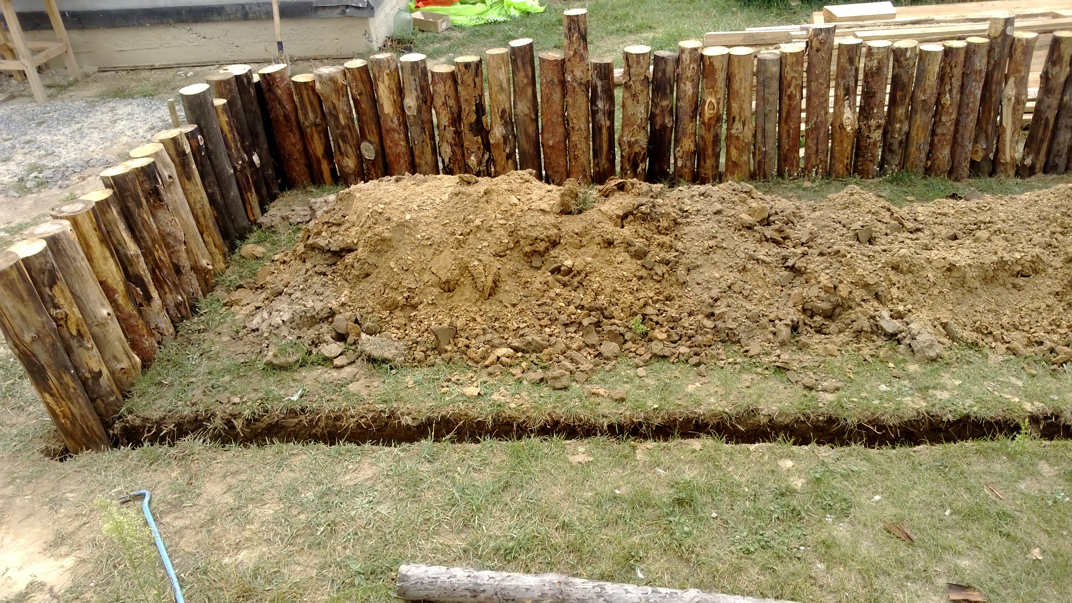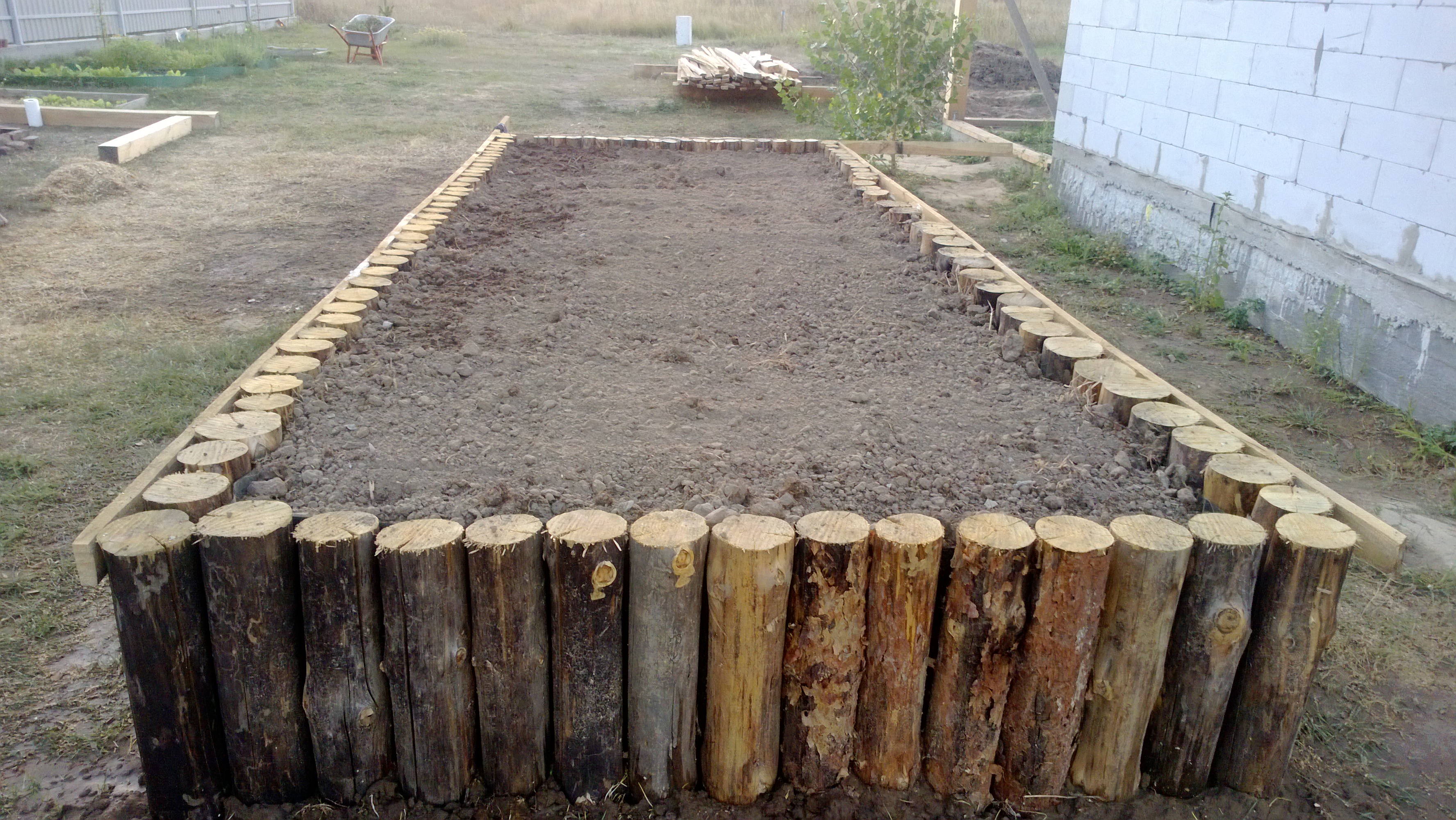 Засыпка. У нас на участке скопились горки земли: там от фундамента, там от септика. В общем, нашлось куда их засыпать. Важно! Перед тем как засыпать внутреннюю часть огорода обтянули рубероидом, плюс изнутри посередине каждого бортика скрепили длинными досками по периметру. Для еще большей прочности конструкции. Грузили землю в тачку и через свободную сторону заезжали в огород. В итоге вышло так. На первое время по внешнему периметру также прикрепили доску, чтоб огород устоялся, земля осела.
