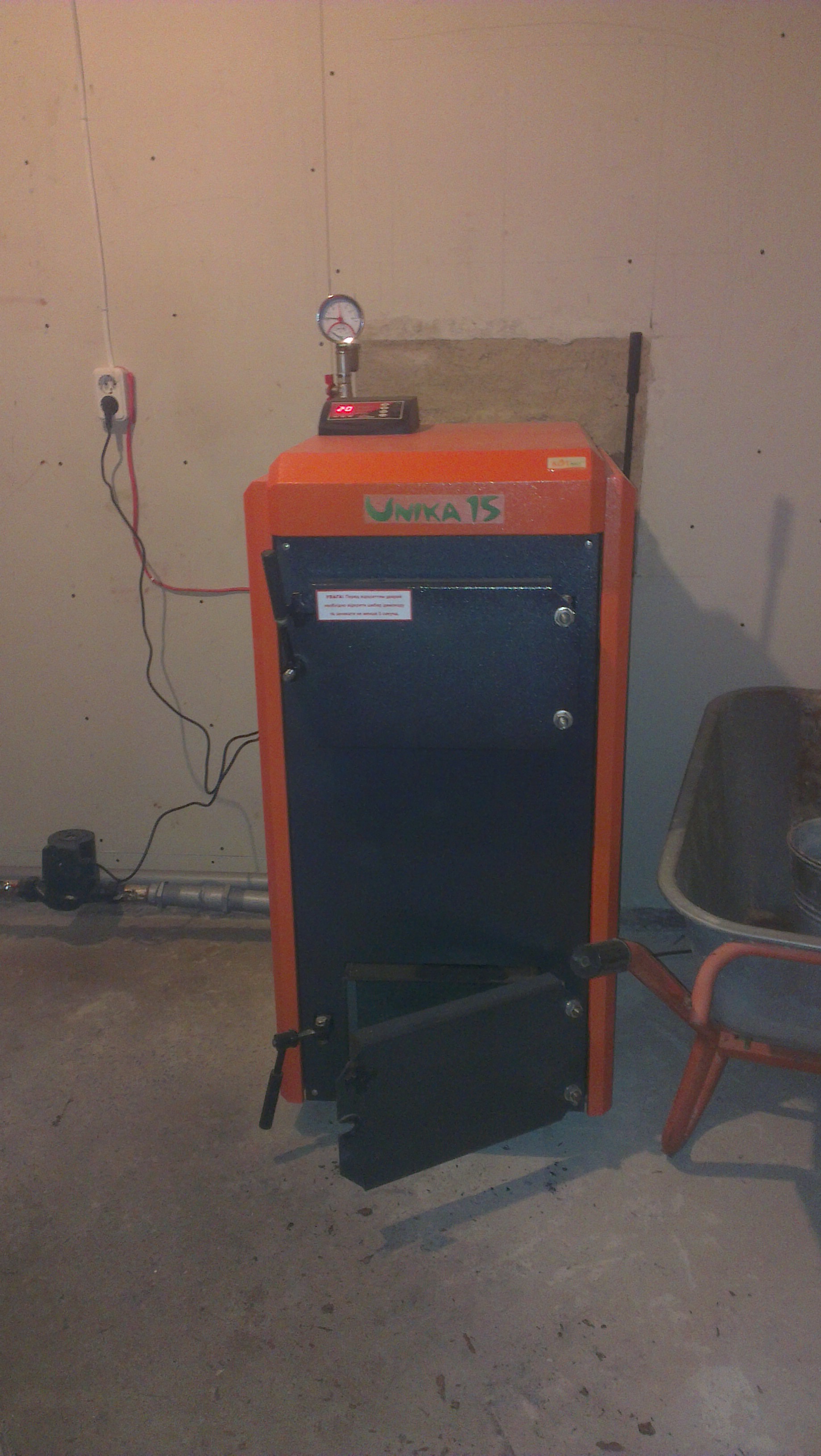Котел пиролизный, 15 квт, украинского производства КОТэко Unika, контроллер — польский (идет с котлом). Минимальная температура +30 макс +85. «Кушает» дрова, опилки и брикеты.