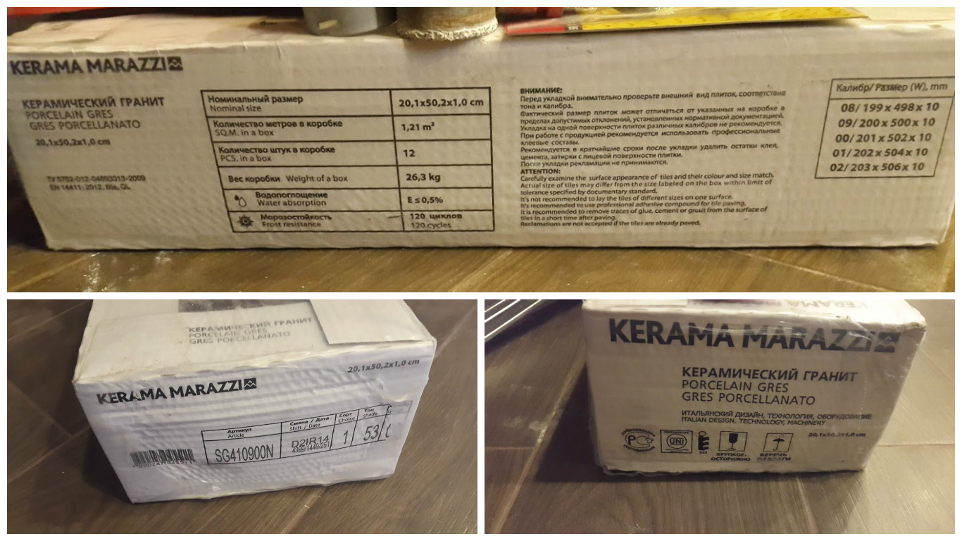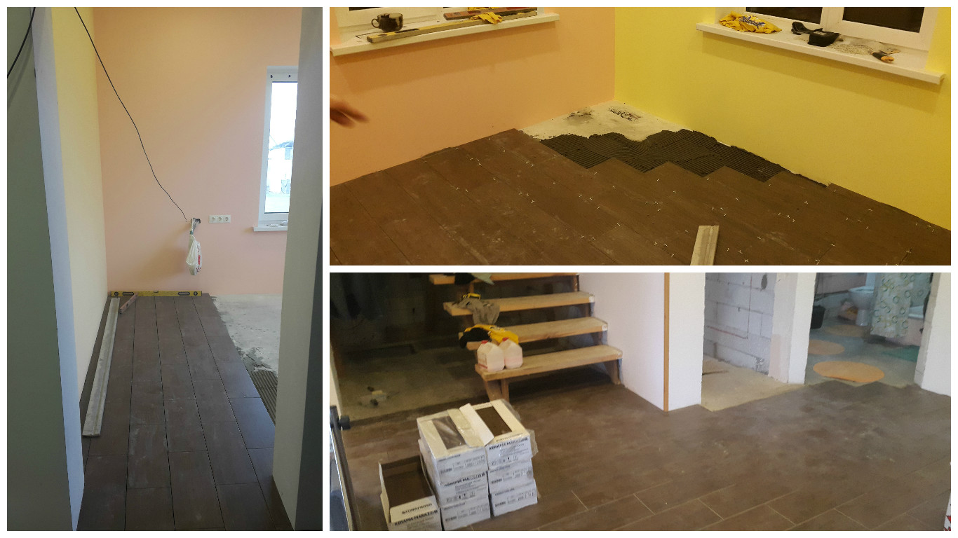 Выбор плитки.  По типу мы выбрали для пола —  керамогранит с рисунком под светлое и темное дерево, матовый. Он долго служит, прочен и устойчив к механическим воздействиям, в чем я убедилась не раз роняя банки, тарелки и железные крышки от кастрюль:)
