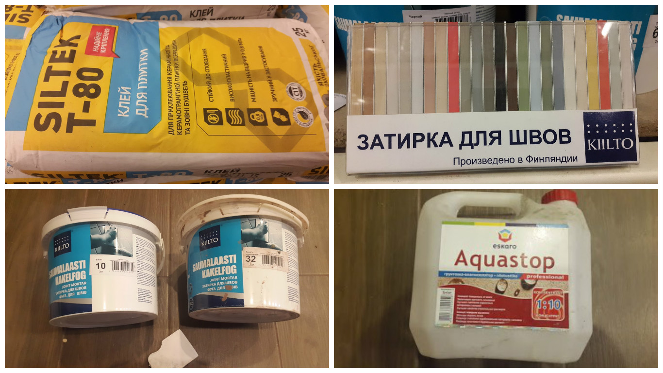 Грунтовка. Клей. Затирка Все это ниже на фото. Крестики пластиковые —  размера 1,5 мм. Для сохранения равных и ровных промежутков.