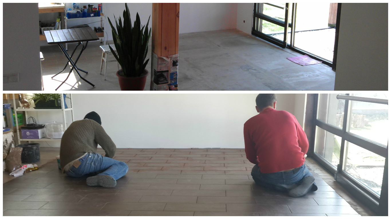 А вот он, Мастер золотые руки, который клал полы, и собственно, сам теплый кафельный пол.